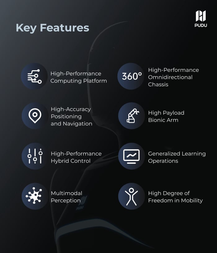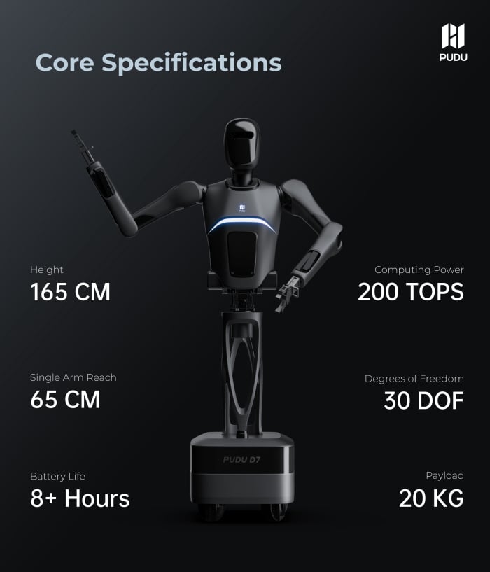 eine zukunftsweisende Innovation mit beeindruckender Mobilität, Geschicklichkeit und verkörperter Intelligenz. Der D7 kombiniert einen menschen-ähnlichen Oberkörper mit einem omnidirektionalen Fahrwerk und meistert dadurch komplexe Aufgaben in unterschiedlichsten Umgebungen.